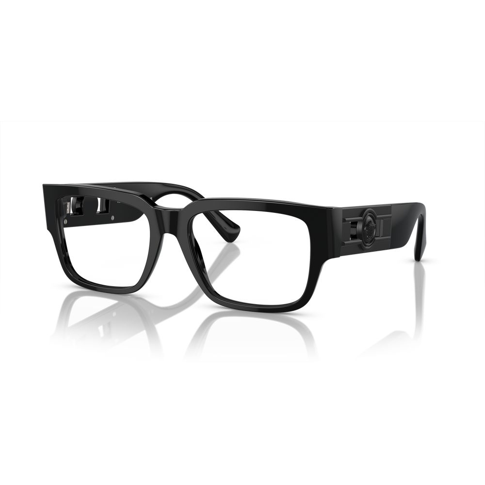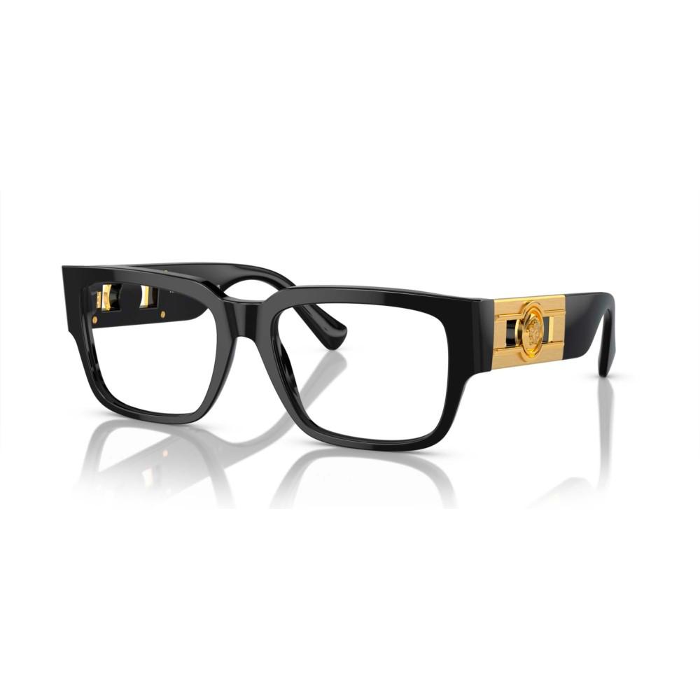 Occhiali da vista originali Versace VE 3350. Modello uomo, di forma geometrico della collezione Versace 2024. La montatura è in acetato, di colore black gold. Tutti gli occhiali da vista sono originali e garantiti.